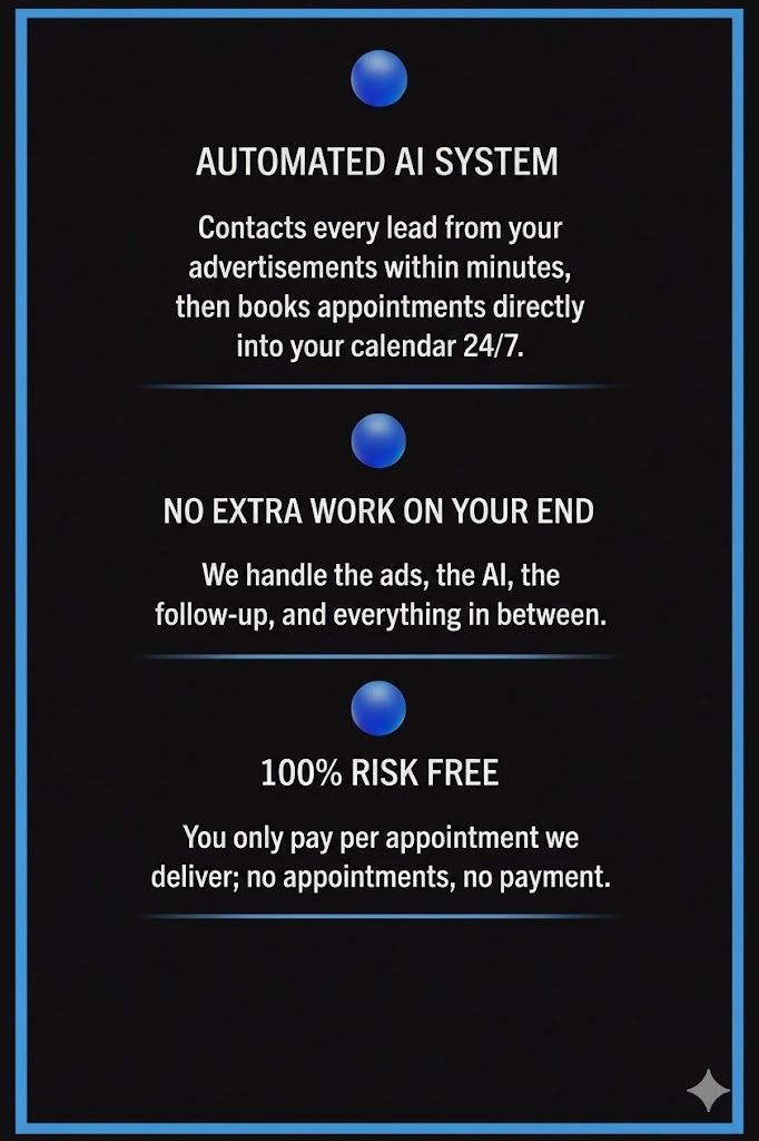 We run your ads, our AI calls every lead within minutes, and books them straight into your calendar — you only pay when we deliver results.